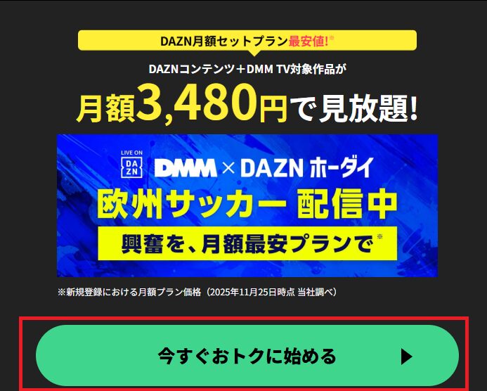 また、DAZN公式から登録するよりDMM×DAZNホーダイを利用した方が1ヶ月720円も安くなるため、非常にお得になっております。