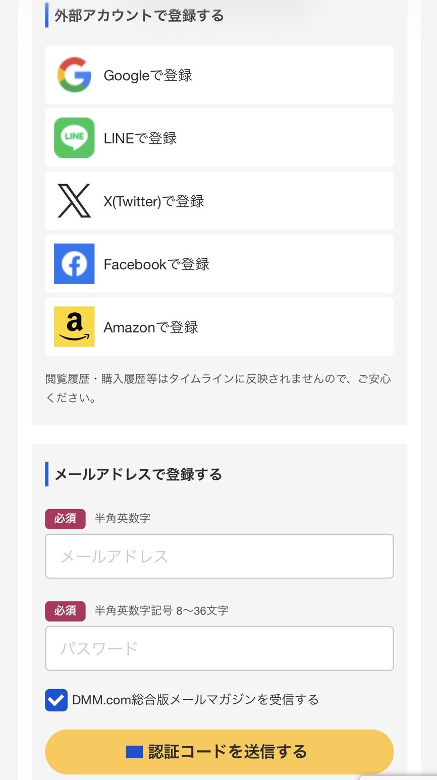 下にスクロールし「外部アカウント」もしくは「メールアドレス」でDMMアカウントを登録。